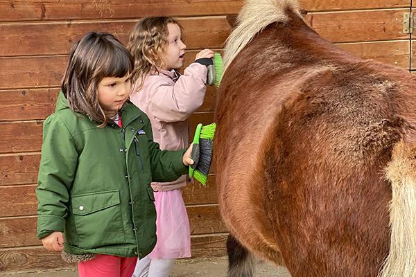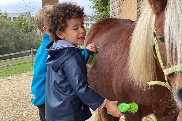 ‘Hof Kleinenberg’ is situated on its namesake being the ‘small hill’ that overlooks the Woluwe valley. A green buffer used by farmers still surrounds it today. Of that land, 1.5 hectare is used by the children of the school. This includes the pony fields and barns, a section for our bees, vegetable gardens, a greenhouse, an orchard, Christmas tree grove, parking and outdoor sports areas. The older students can play their guitars in the courtyard, play soccer in an adjacent field and table tennis outside. The fields are occupied by the ponies, Pipo and Colin, and horse Verona who love being visited by groups of children coming down with their teachers to brush and feed them.